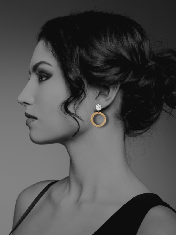 The textured disc hoop is finished with gold vermeil. Coins are often worn as decorative elements forming parts of headresses, hats and clothes.