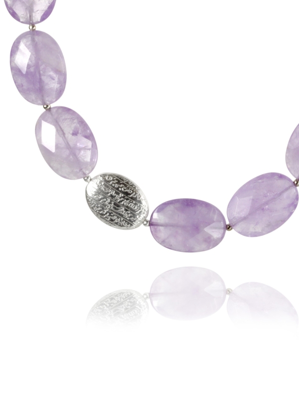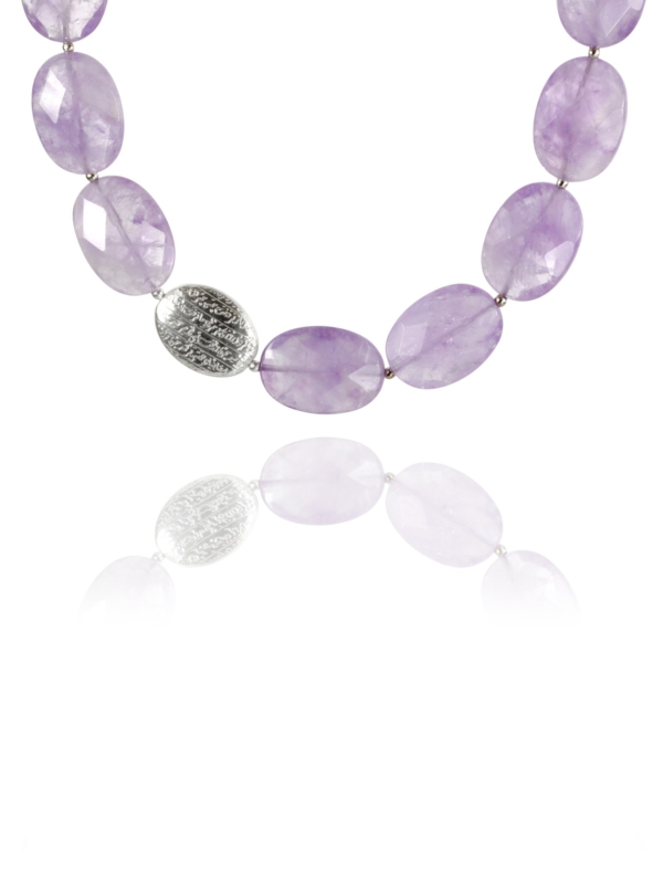 The design of this necklace was inspired by the traditional prayer beads (Tasbeh) used in the region since ancient times and the silver bead symbolizes the different shaped bead often included to help with counting. It features a calligraphic impression of the poetry of Hafez, a Persian poet widely admired in the rest of the world.