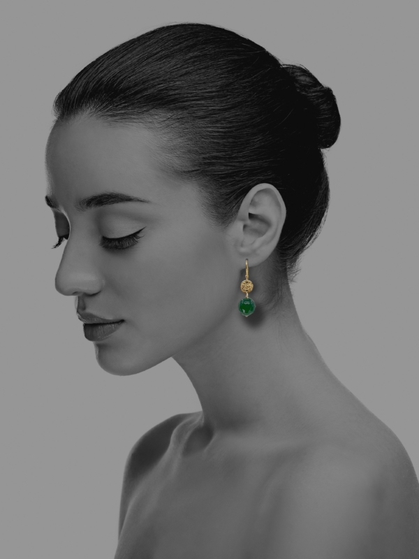 These stylish earrings feature a coin with a calligraphic impression of an old Persian coin. Coins are often worn as decorative elements forming parts of headdresses, hats and clothes. The textured coin and the bezel are finished in gold vermeil.