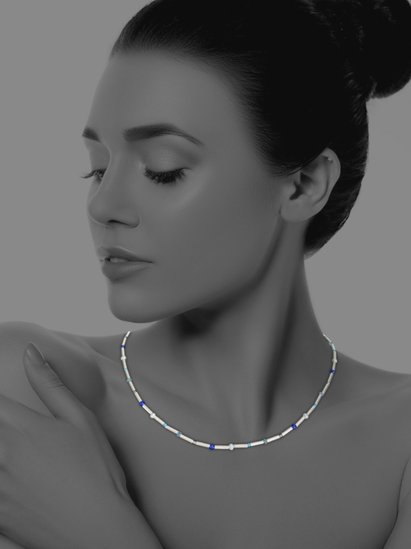 The design of this delicate necklace was inspired by the captivating desert night sky where endless constellations of stars and planets dazzle with lights and colours. Featuring selected aquamarine, turquoise and lapis beads