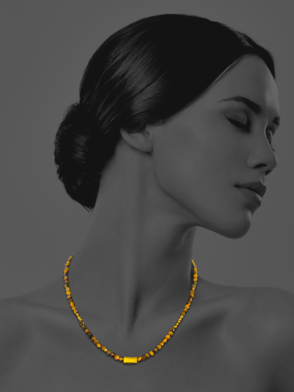 The design of this delicate necklace was inspired by the captivating desert night sky where endless constellations of stars and planets dazzle with lights and colours. Featuring selected tiger eye beads.